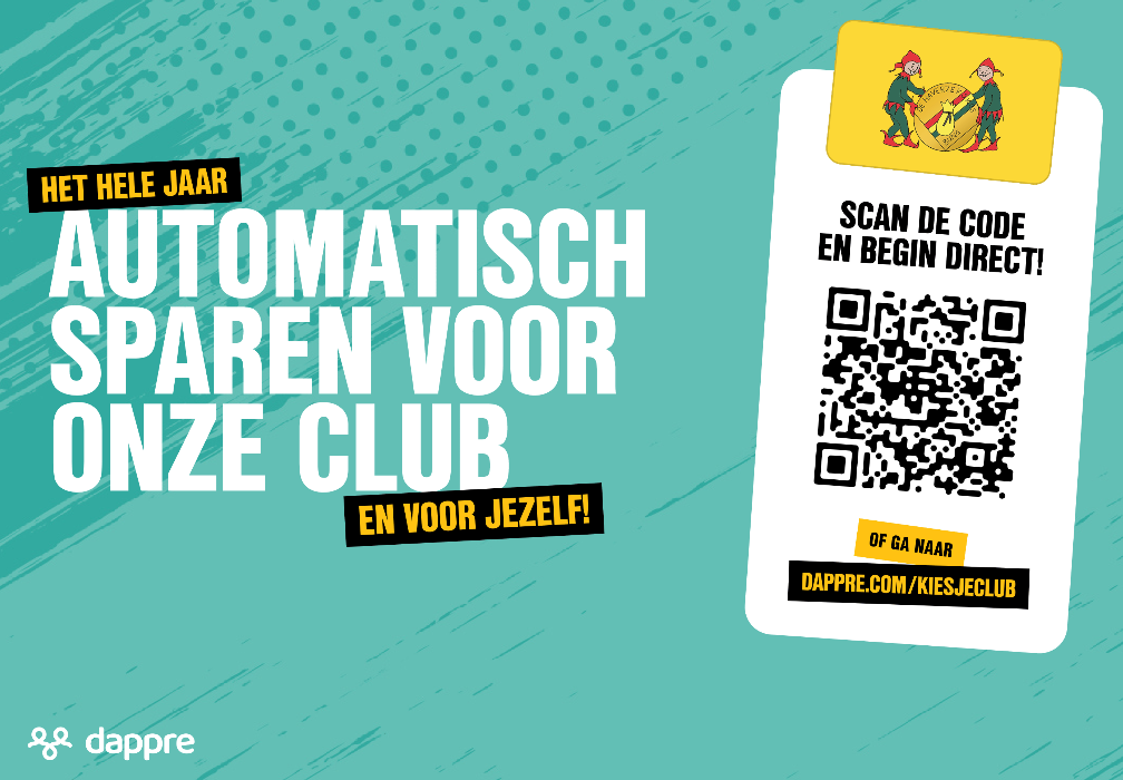 Wij doen met onze club mee met Dappre Clubs: een unieke en structurele manier om het hele jaar automatisch Euro's te sparen voor onze club én voor jezelf: bijvoorbeeld voor je contributie, vouchers en toegangsbewijzen.